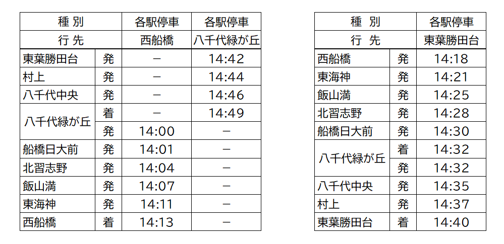 本列車の停車駅は東葉勝田台・八千代緑が丘・北習志野・西船橋です。その他の駅は通過となりますのでご利用の際はご注意ください。