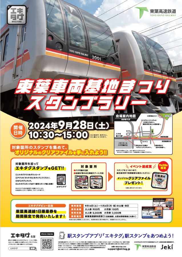 また、当社では「エキタグ」の導入を記念して、対象箇所8駅のスタンプ全てを集めると限定デジタルスタンプを獲得できる「エキタグデビュー記念ラリー」や9月28日(土)に開催される「第14回東葉車両基地まつり」において、オリジナルクリアファイルがもらえる「東葉車両基地まつりスタンプラリー」を開催します。